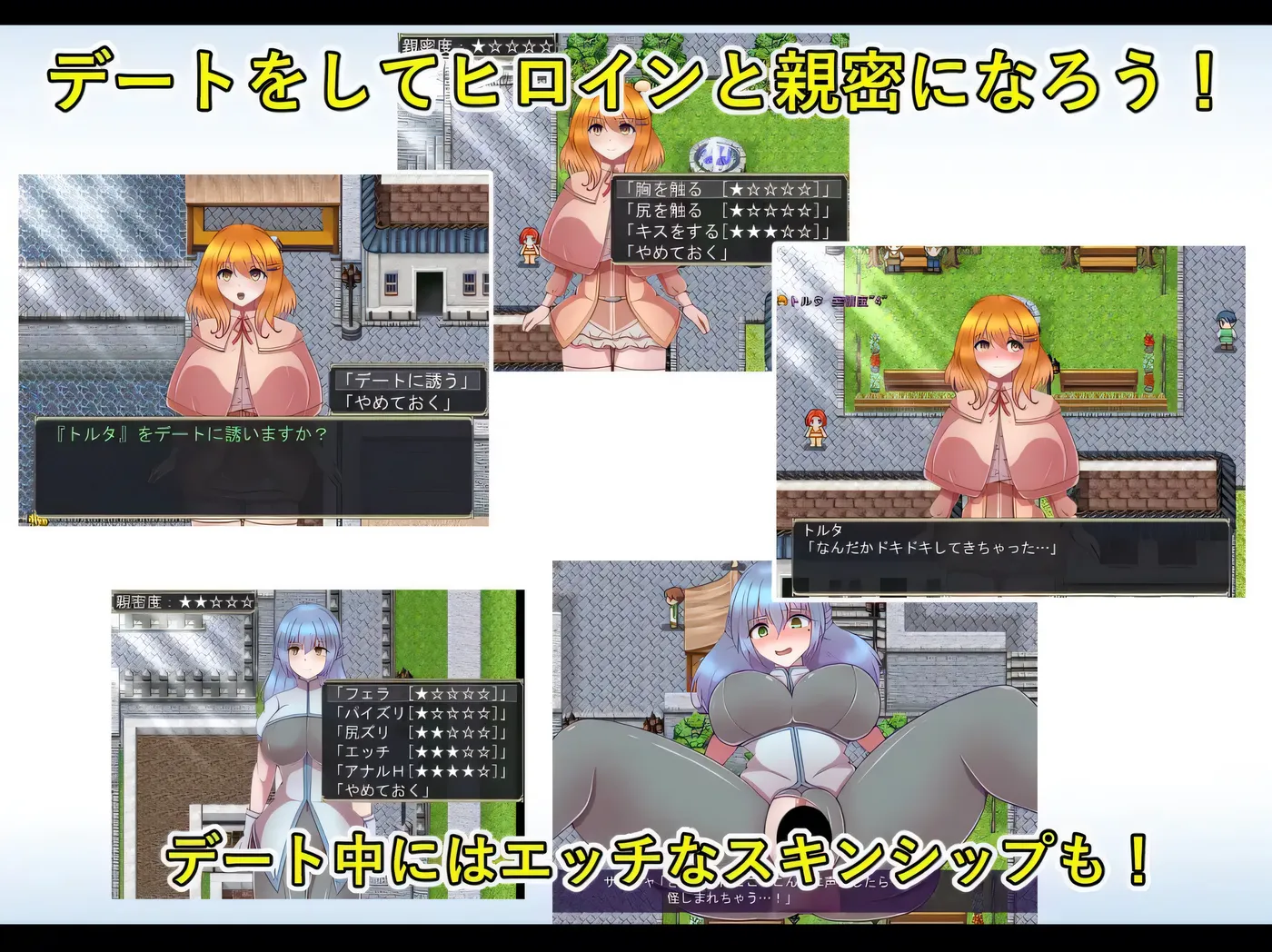 通过约会加深与两位女主角的关系,解锁各种H场景,兼具成人游戏的特色;同时探索迷宫、以指令战斗击败敌人推进剧情的RPG要素,两者兼备的成人RPG。